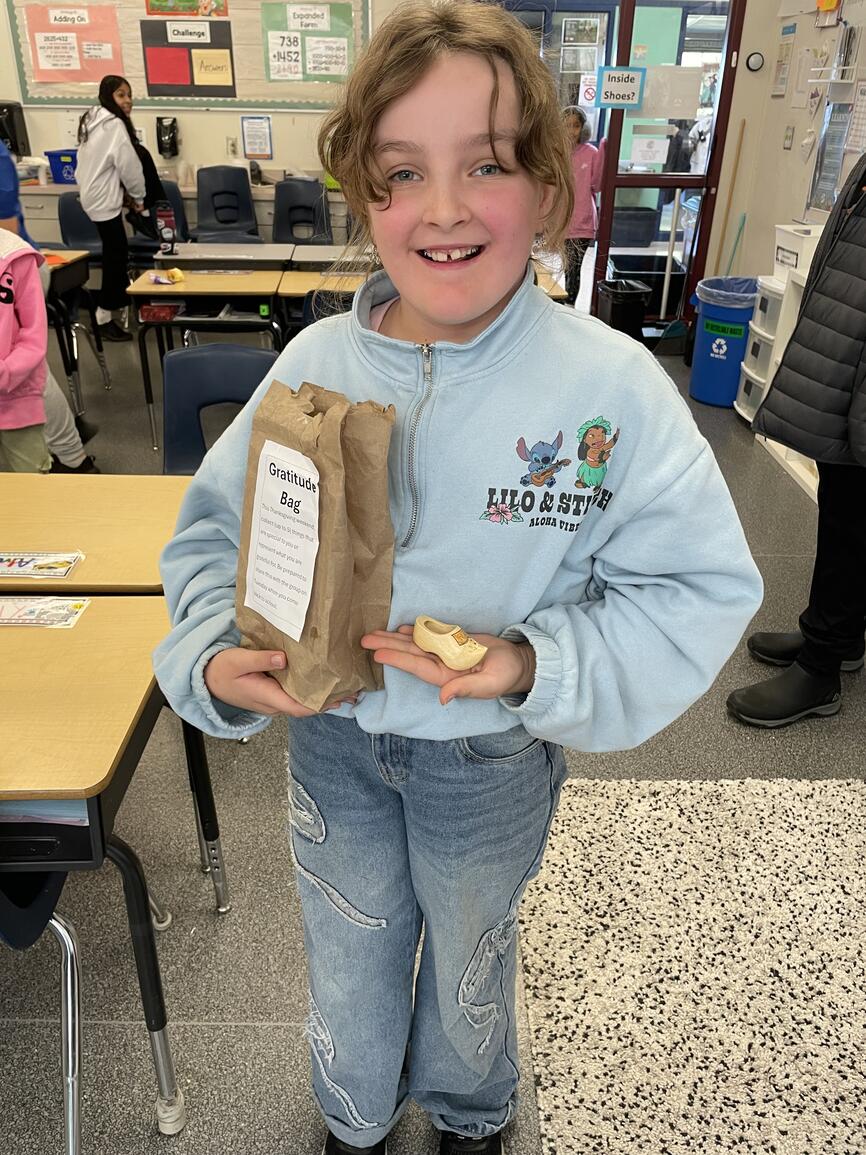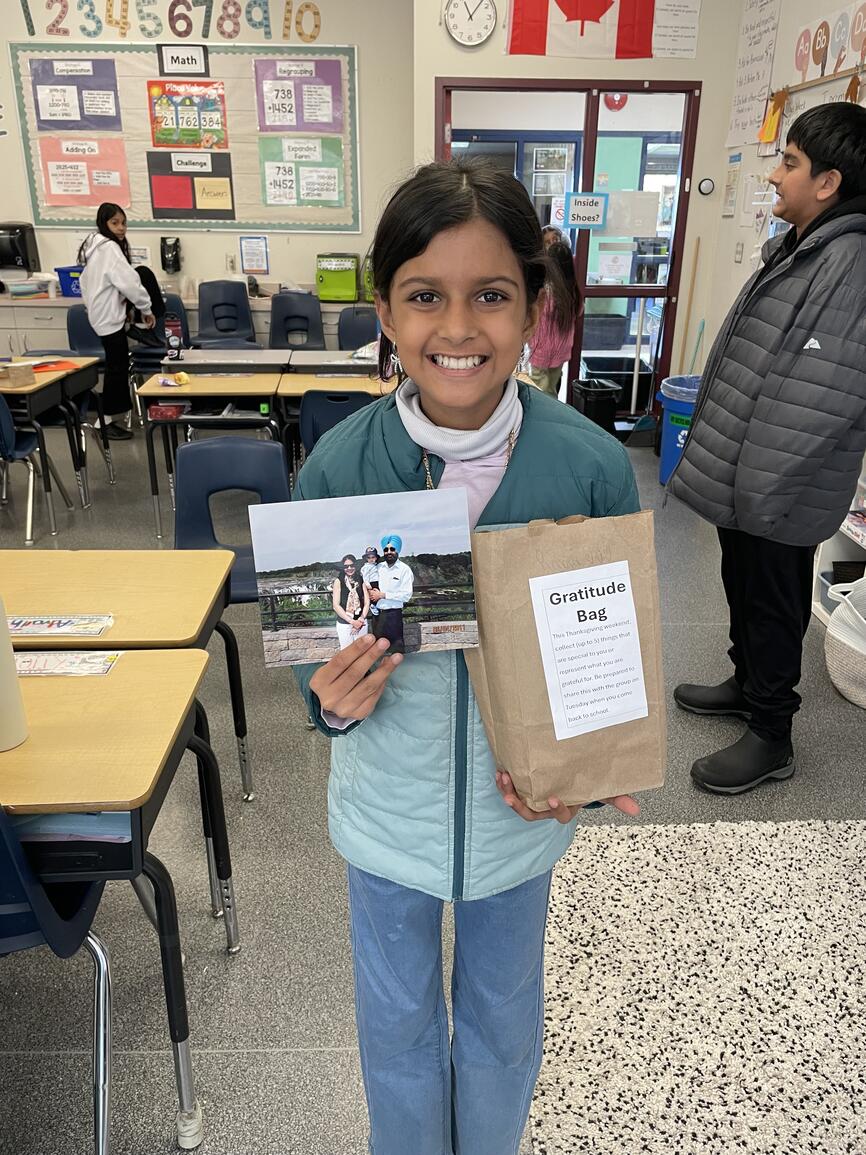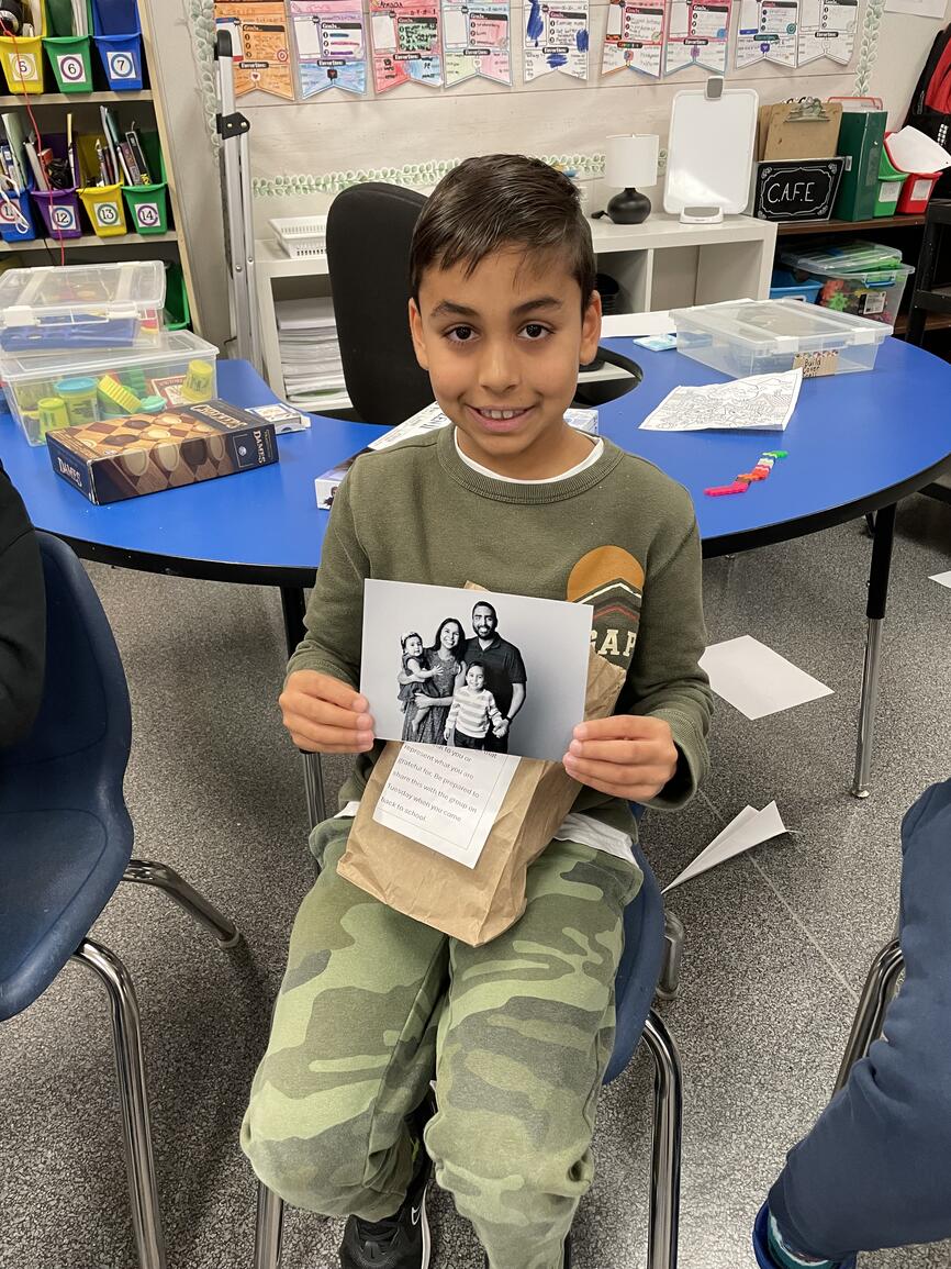 Students are sharing what they are grateful for in their life. They chose special possessions from home, such as pictures or an object that is a symbol of what they value in their life (i.e., family, culture, sports, achievements, etc.).